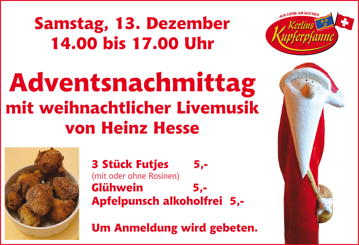 Am 13. Dezember gibt es einen Adventsnachmittag mit weihnachtlicher Livemusik von Heinz Hesse. Dazu gibt es Futjes, Glühwein und Apfelpunsch.