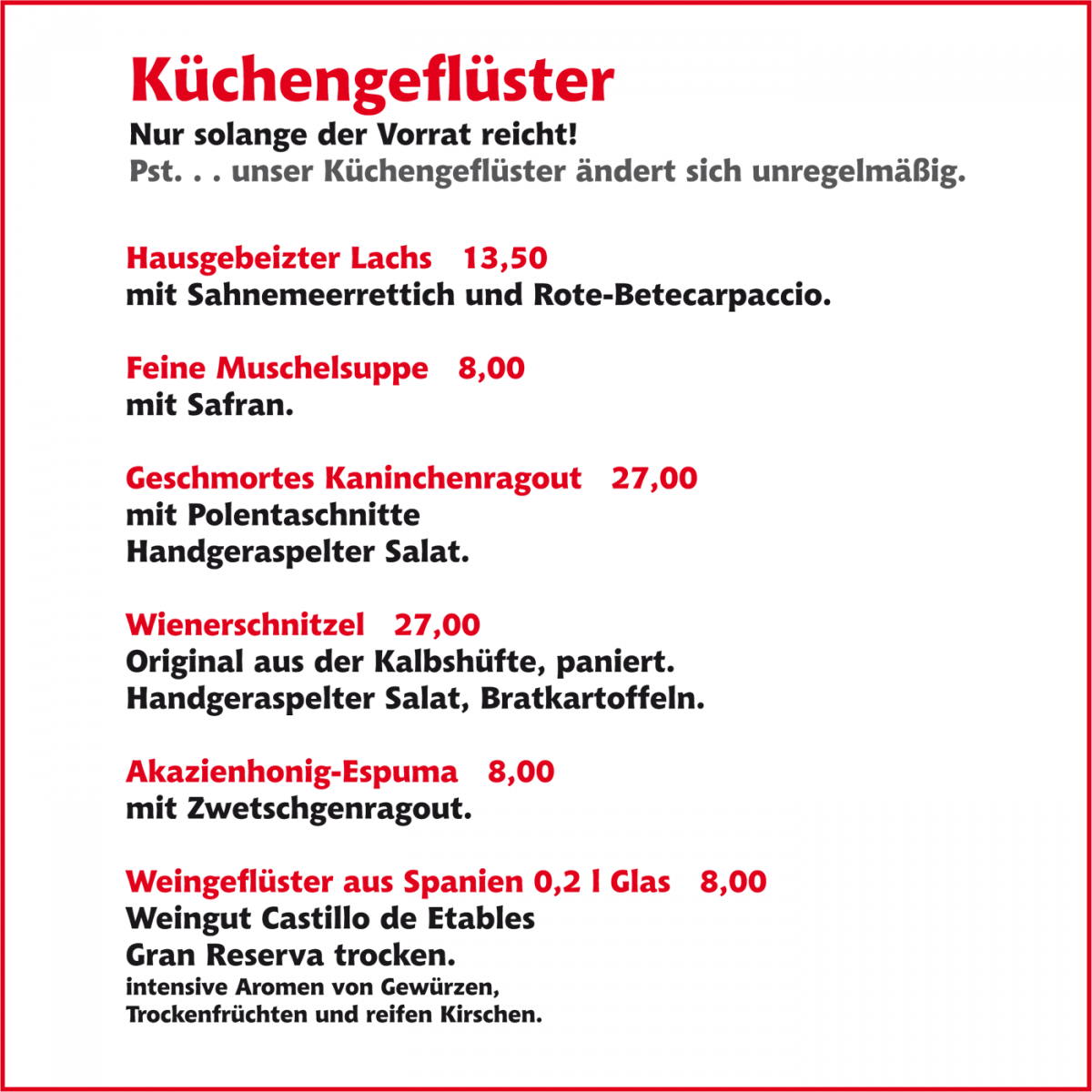 Speisekarte | Jahreszeitliche Karte | Mittagstischkarte | Kaffee & Süßes | Getränke