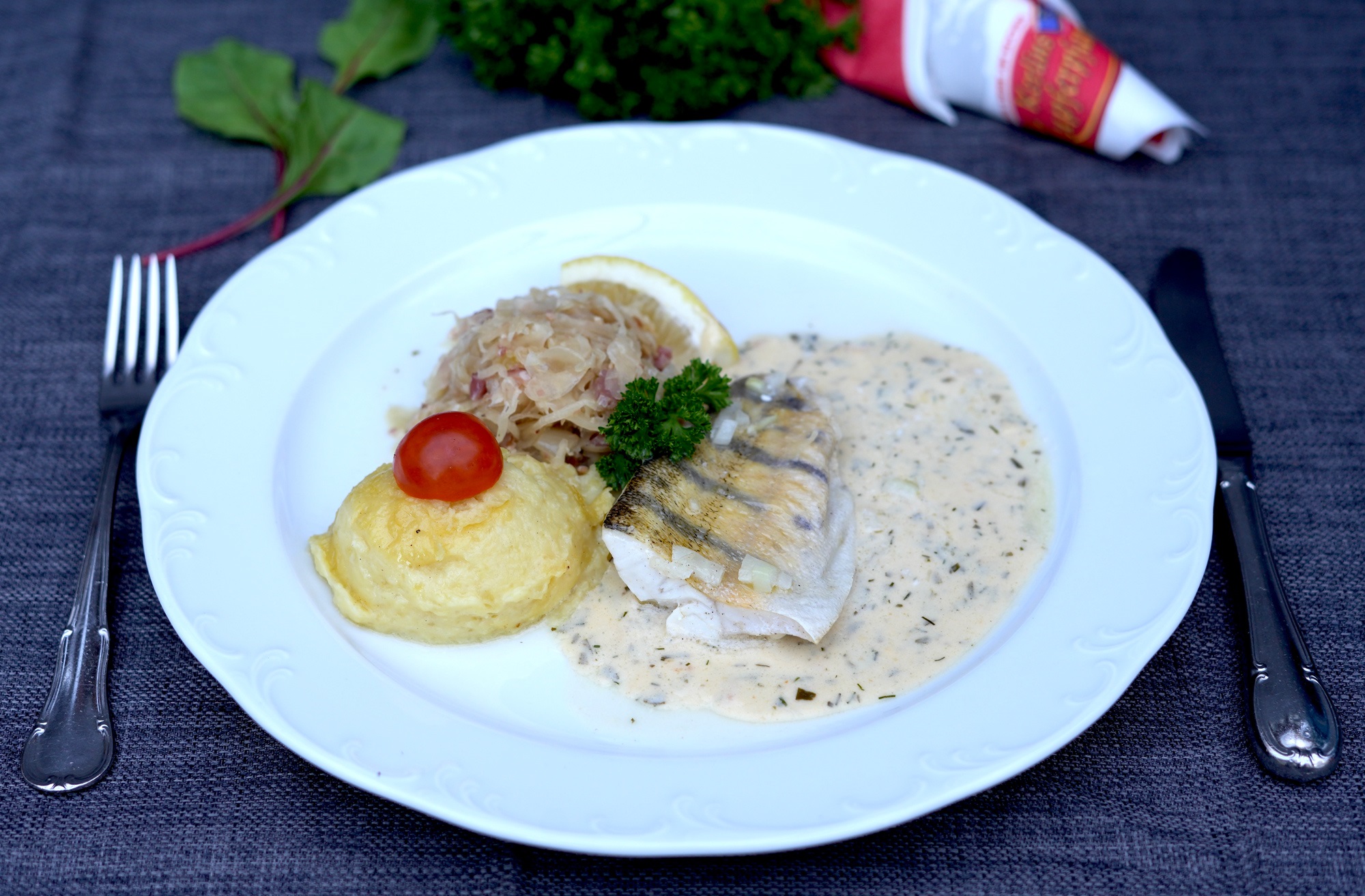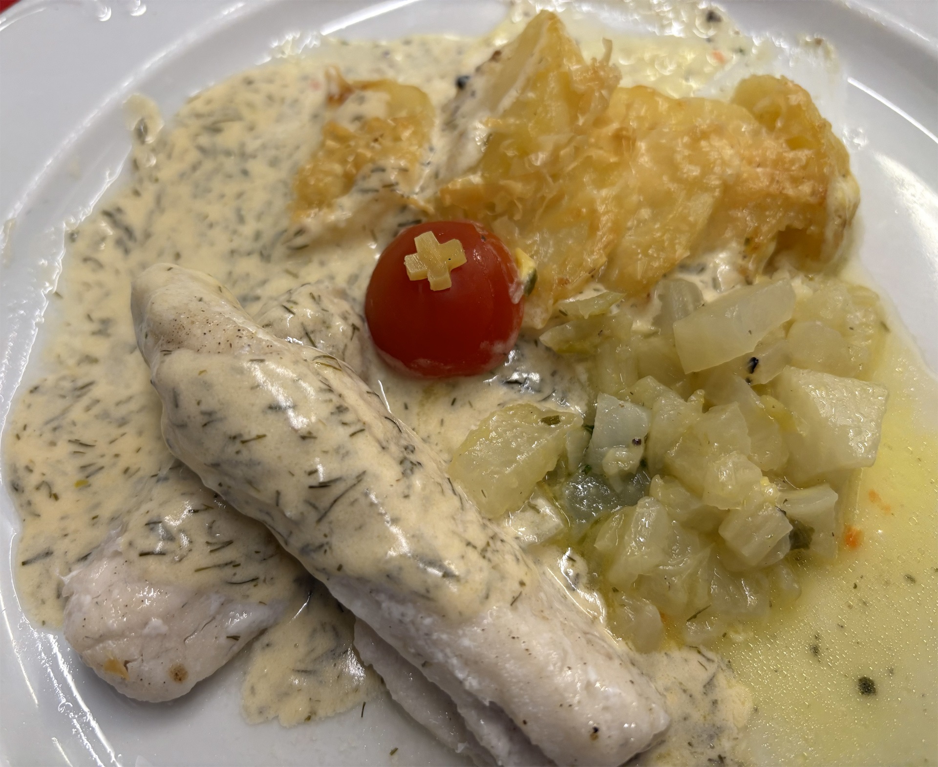 3. Fischfilet vom Egli, gedünstet mit Dill-Weißweinsoße und Kartoffelgratin dazu feines Fenchelgemüse