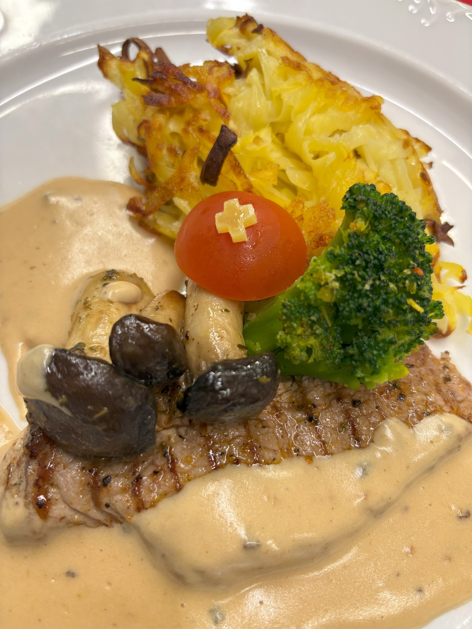 4. Erster Hauptgang: Kalbsteak gebraten mit Rahmpilzen, Brokkoli und Schweizer Rösti