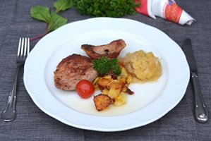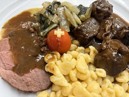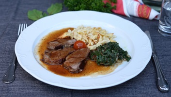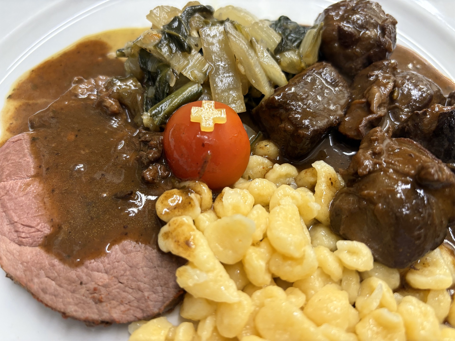 5. Zweiter Hauptgang: Gamsfleisch von der Alpengams mit Dôle du Valais-Soße, mit Schwyzer Knöpfli und Mangoldgemüse