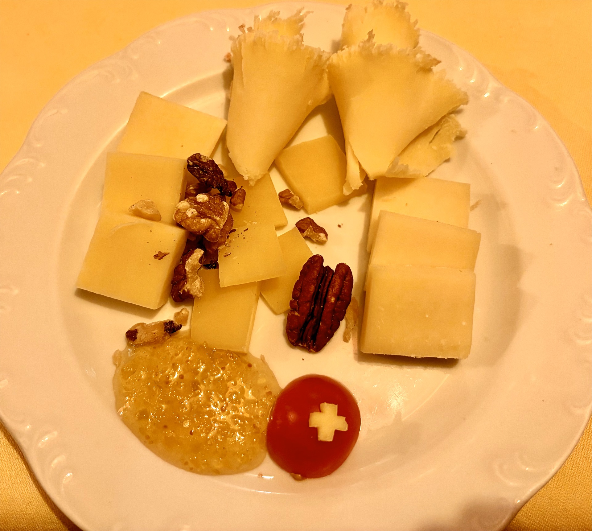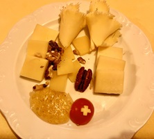 7. Kleiner Schweizer Käseteller mit Appenzeller, Emmentaler, Tête du Moine, und Greyerzer Käse mit Feigensenf