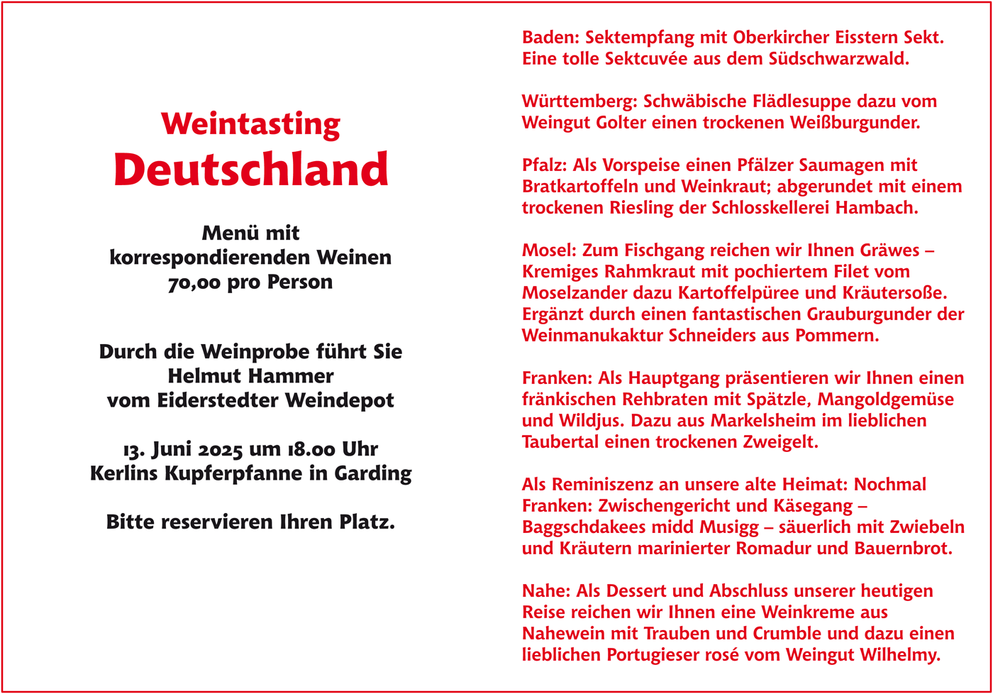 In regelmäßigen Abständen gibt es in Kerlins Kupferpfanne ein Weintasting. Wir unterhalten Sie mit gutem Essen und tollen Weinen, kurzweiligen Geschichten und Anekdoten rund um unser Thema. Serviert wird ein mehrgängiges Menü mit kleinen, erlesenen Speisen, dazu korrespondierende Weine, passend zum jeweiligen Thema.